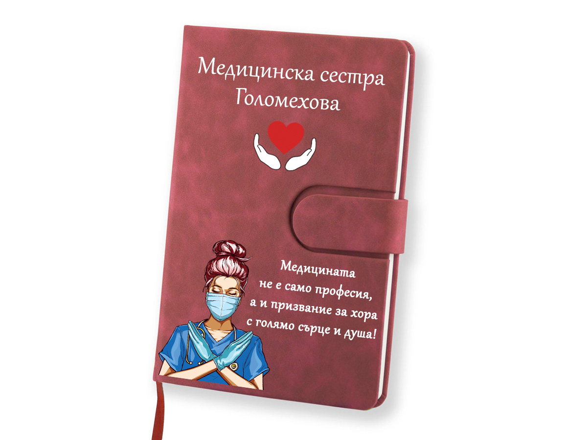 Моделът е изработен с внимание към детайла и включва елегантна визия с напечатана графика на медицинска сестра, която придава изтънчен и класически акцент. Над тази красива графика се изписва избраното от вас име, което прави всеки тефтер напълно уникален и личен.