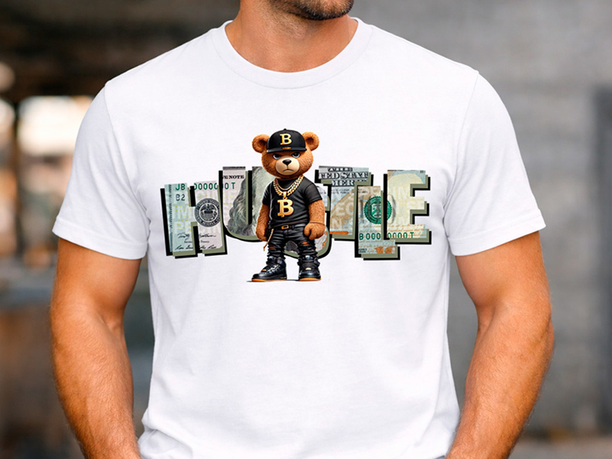Мъжка бяла тениска с къс ръкав и обло деколте Bear Hustle. Стилен streetwear принт на мече и надпис „HUSTLE“ с мотив на банкноти. Модерен дизайн с послание за амбиция и успех. Удобна кройка и мека материя – идеална за ежедневие и градски визии.