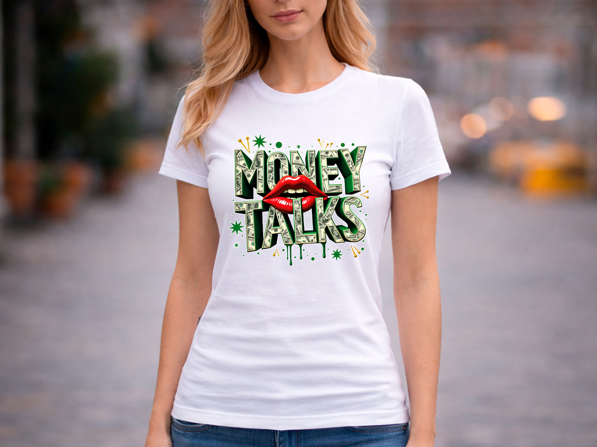 Дамска бяла тениска с ефектен принт Money Talks, комбиниращ 3D доларов надпис и ярки червени устни. Модерен streetwear дизайн, удобна дамска кройка и устойчив печат.