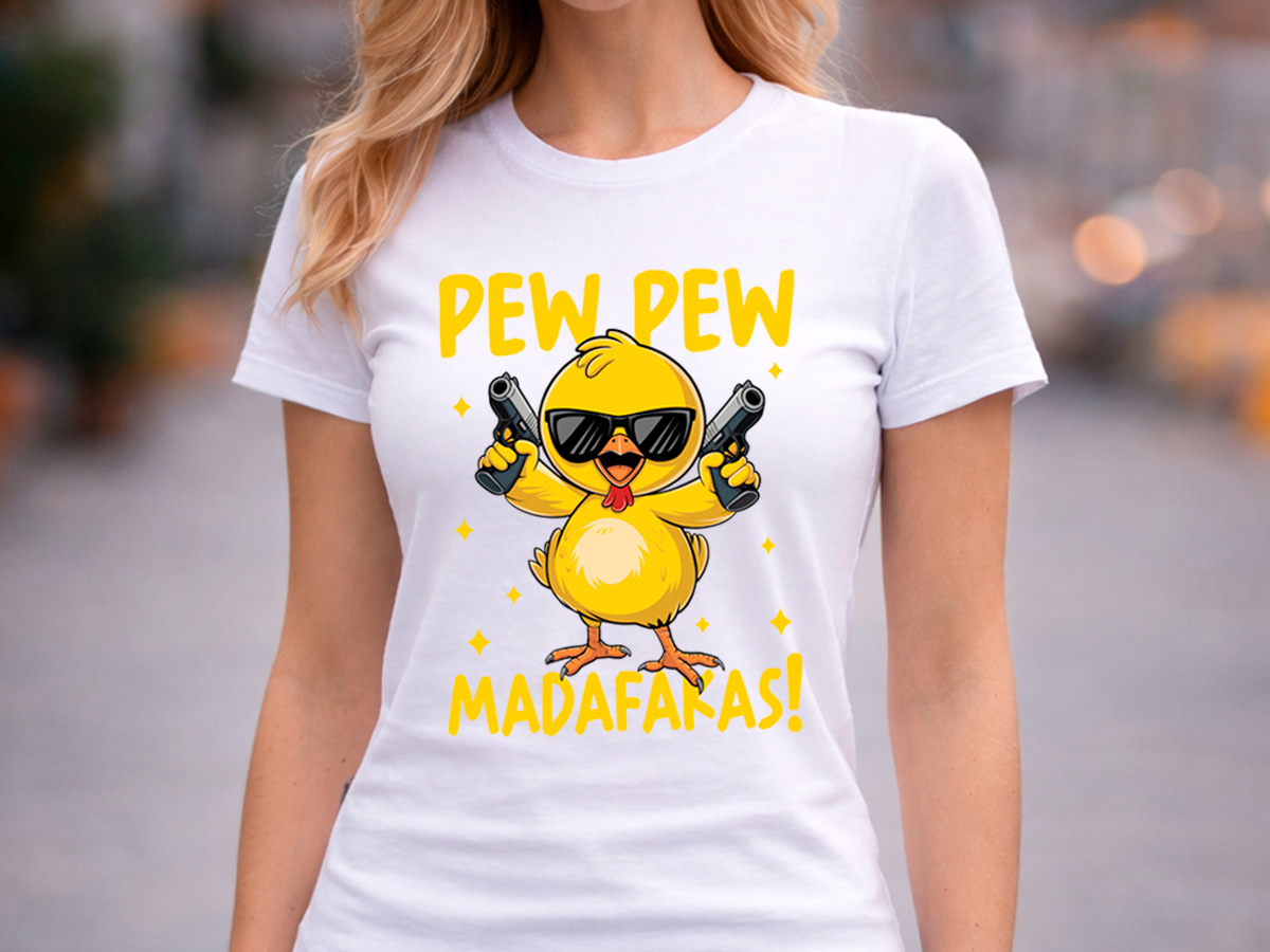 Забавна дамска бяла тениска „Pew Pew Madafakas“ с оригинална щампа на пиленце със слънчеви очила. Перфектна за хора с чувство за хумор и любов към нестандартните дизайни.