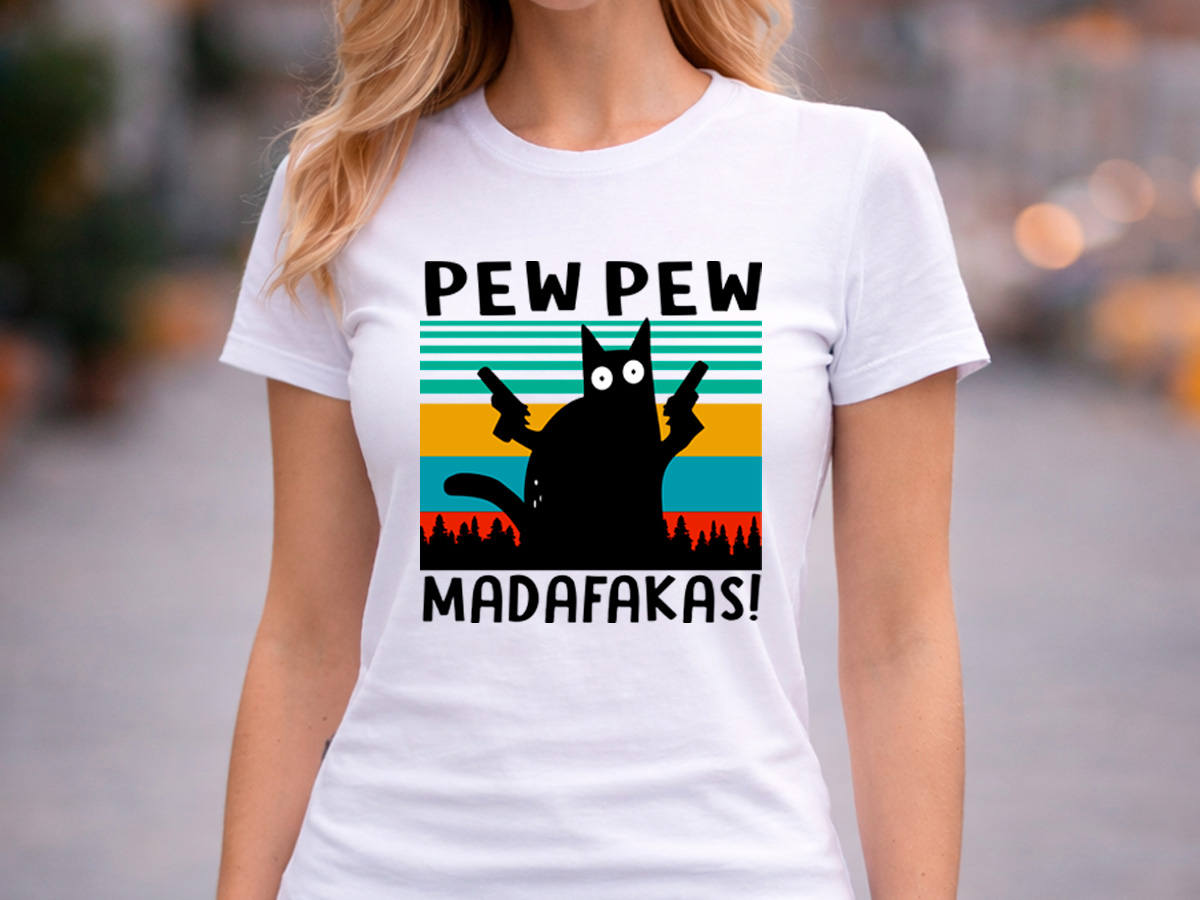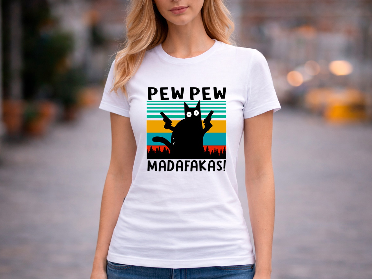 Стилна и забавна дамска бяла тениска „Pew Pew Madafakas“ с оригинална щампа на котка в ретро стил. Перфектна тениска за хора с чувство за хумор и любов към нестандартните дизайни.