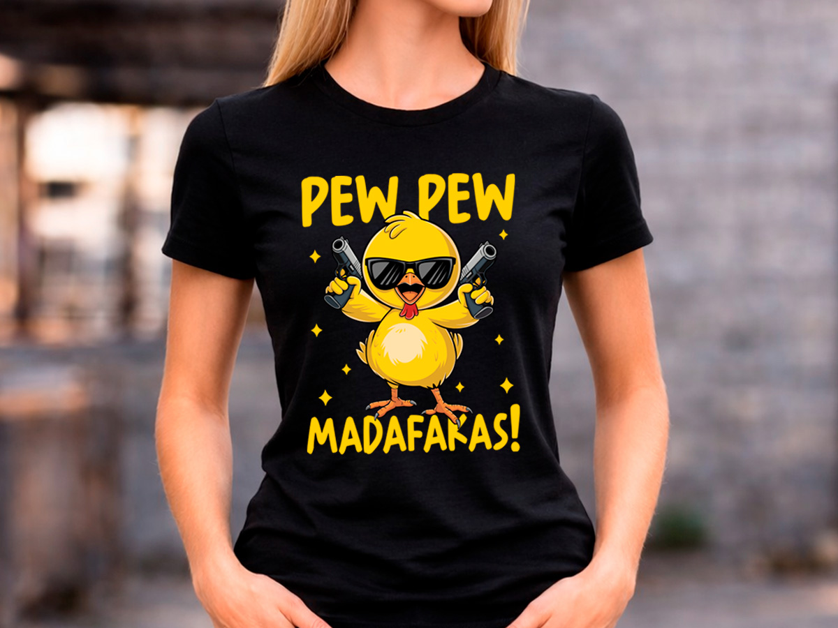 Забавна дамска черна тениска „Pew Pew Madafakas“ с оригинална щампа на пиленце със слънчеви очила. Перфектна за хора с чувство за хумор и любов към нестандартните дизайни.