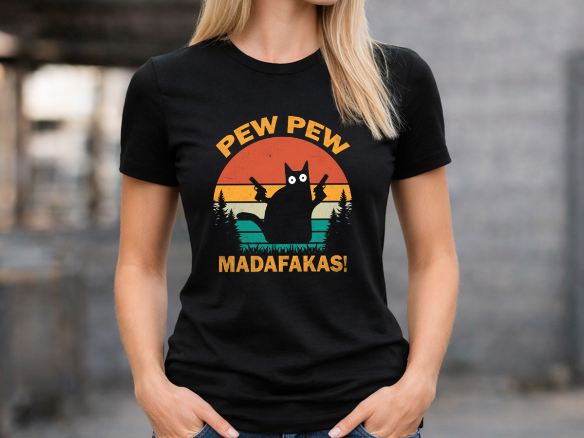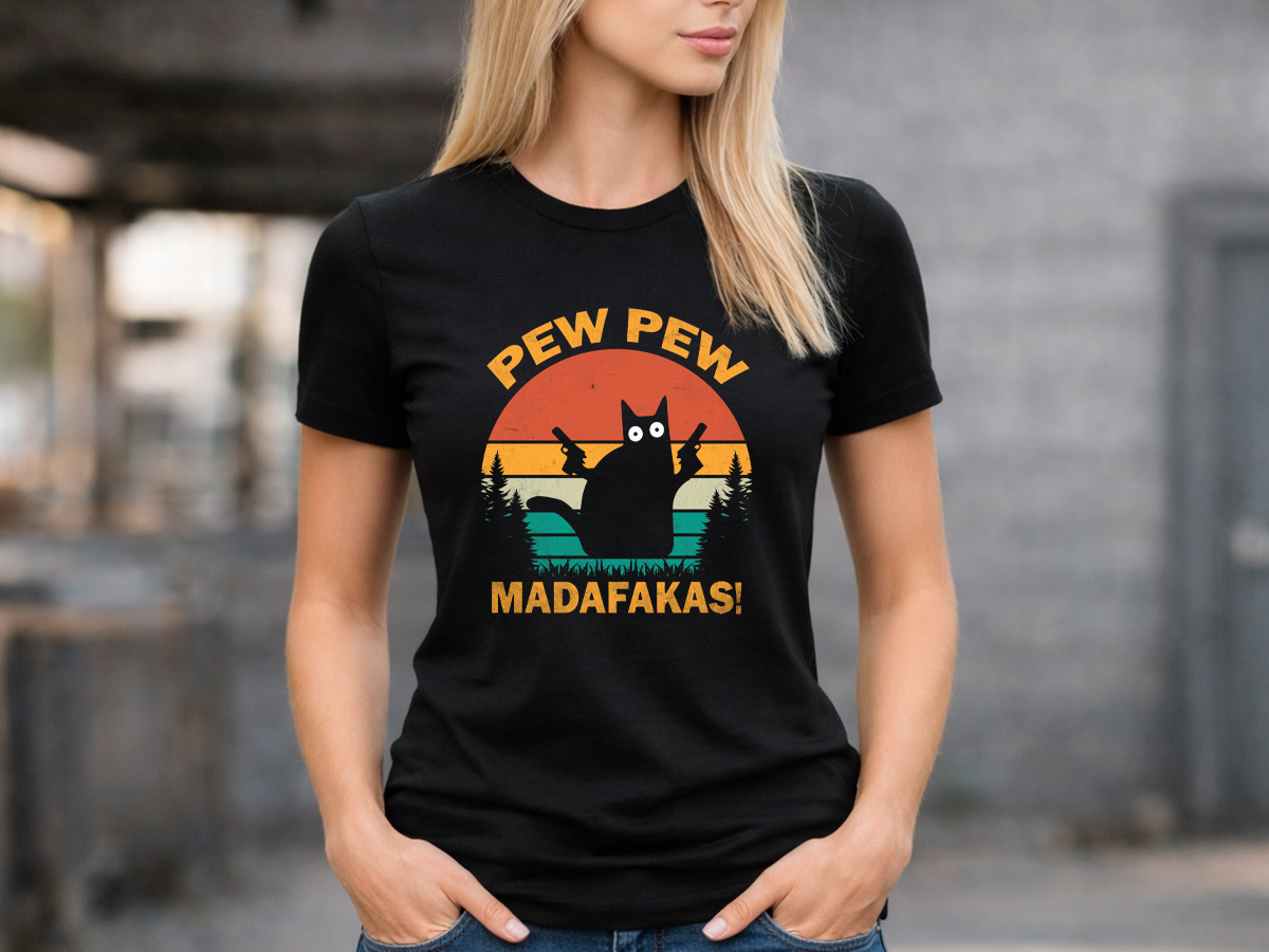 Забавна дамска черна тениска „Pew Pew Madafakas“ с оригинален дизайн на котка в ретро стил. Тази тениска е идеална за хора с чувство за хумор и любов към нестандартните щампи.