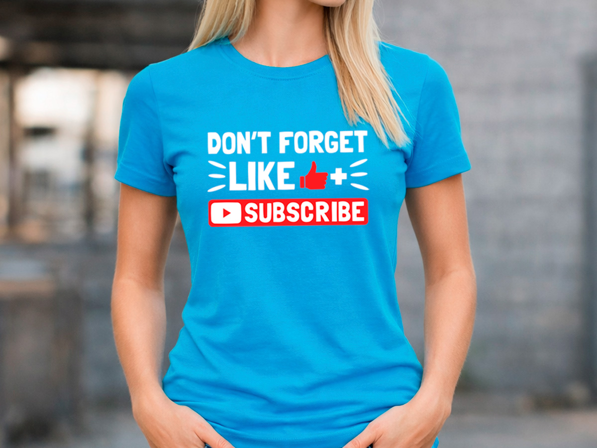 Стилна дамска синя тениска „Don’t Forget Like & Subscribe“, вдъхновена от YouTube културата. Перфектен избор за създатели на съдържание и фенове на социалните мрежи.