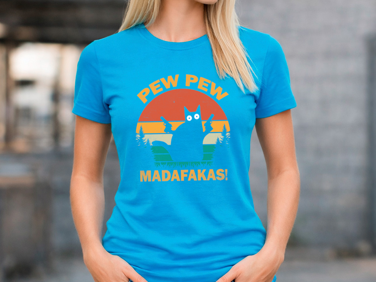 Забавна дамска синя тениска „Pew Pew Madafakas“ с оригинален дизайн на котка в ретро стил. Тази тениска е идеална за хора с чувство за хумор и любов към нестандартните щампи.