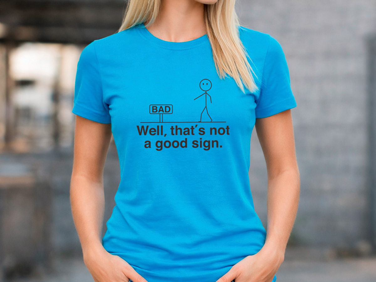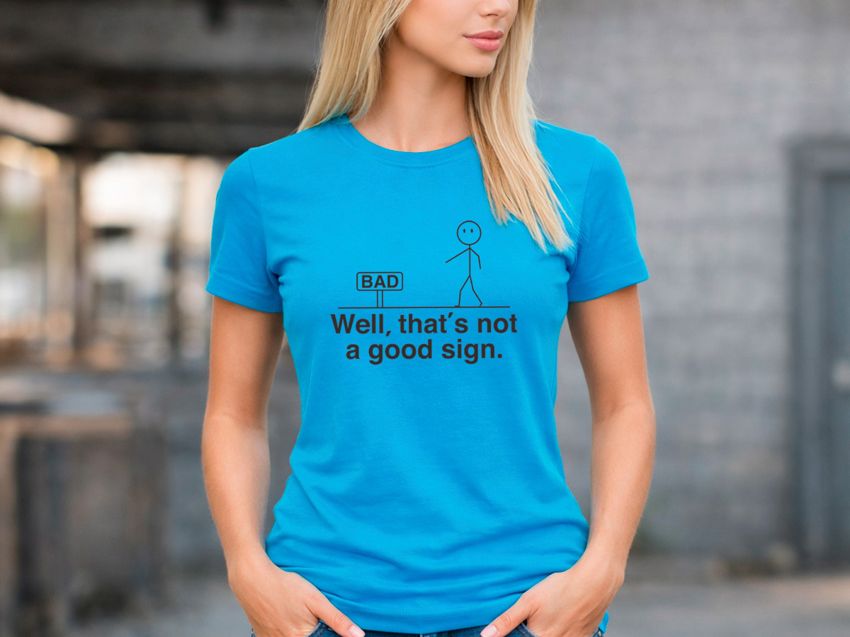 Стилна и забавна дамска синя тениска „Well, That’s Not a Good Sign“ с минималистичен дизайн и хумористично послание. Подходяща за ежедневна визия и хора с чувство за сарказъм.