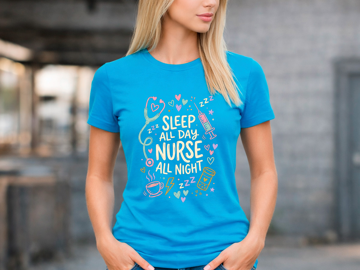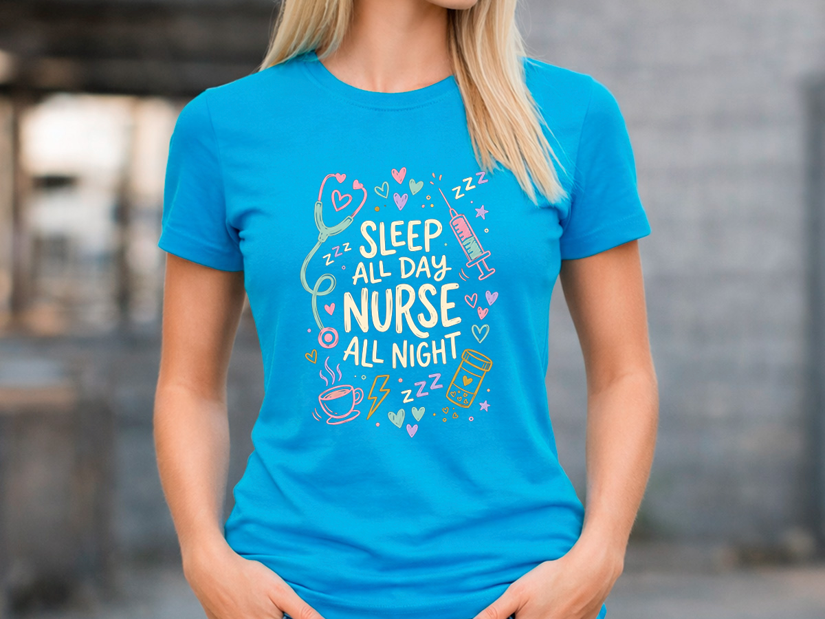 Стилна дамска синя тениска „Sleep All Day, Nurse All Night“, създадена специално за медицински сестри и хора в здравеопазването. Забавен и цветен дизайн с медицински елементи.