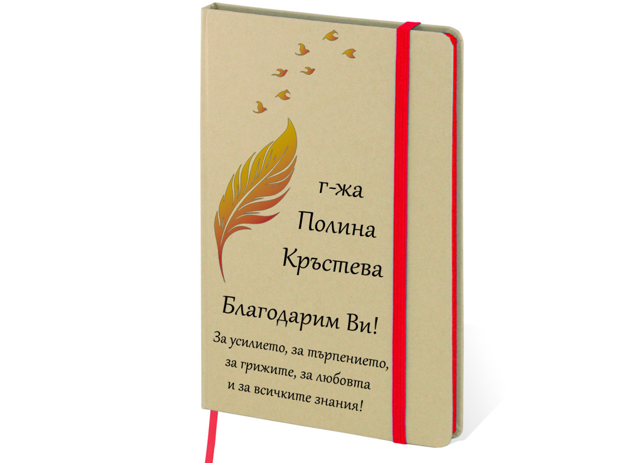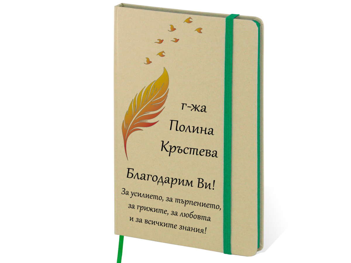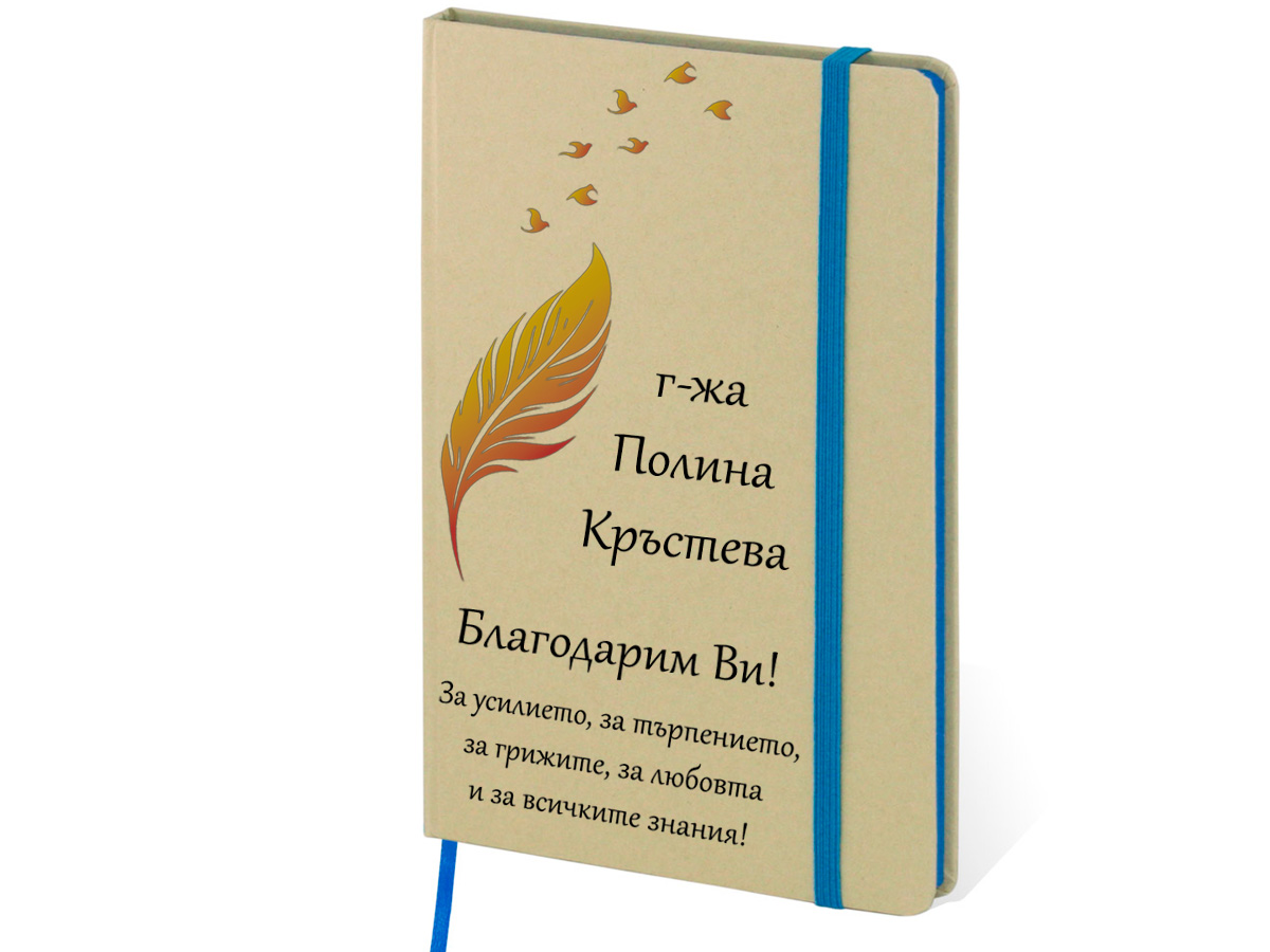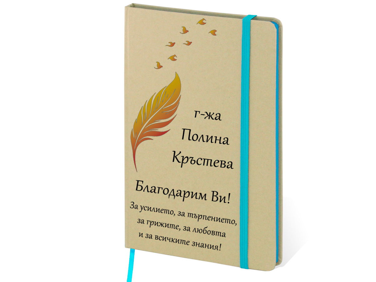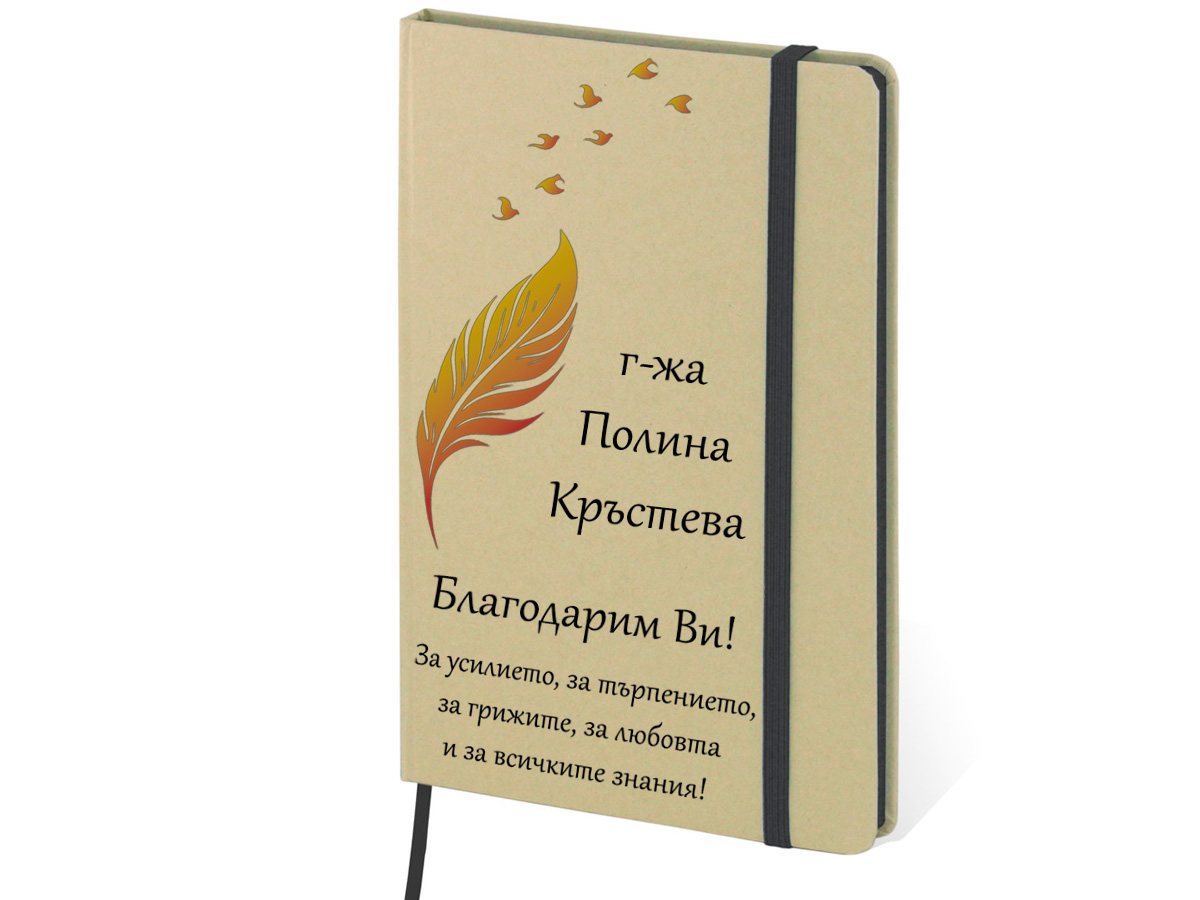 Еко тефтер 147 х 210мм. Моделът е изработен с внимание към детайла и включва елегантна визия с напечатано перо и птици, които придават изтънчен и класически акцент. Под тази красива графика се изписват избраното от вас име и пожелание, което прави всеки тефтер напълно уникален и личен.