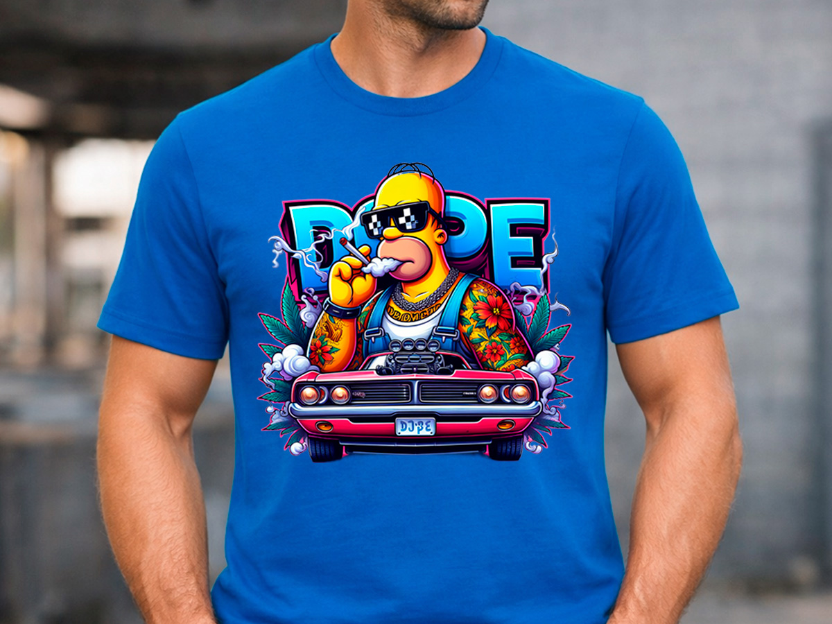 Мъжка синя тениска Homer Simpson с ретро автомобил и надпис DOPE.