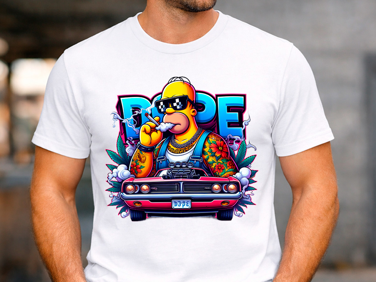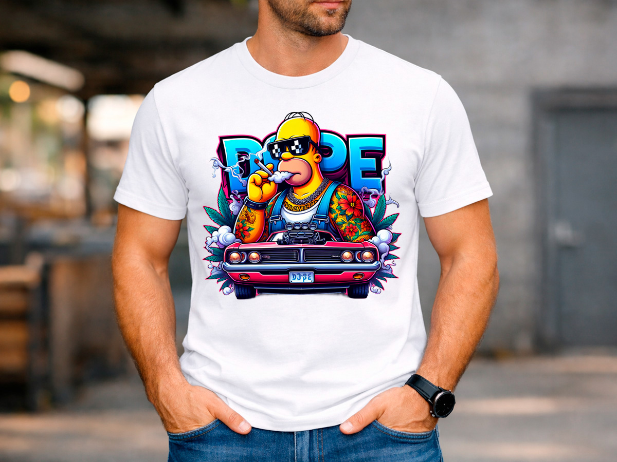 Мъжка бяла тениска Homer Simpson с ретро автомобил и надпис DOPE.