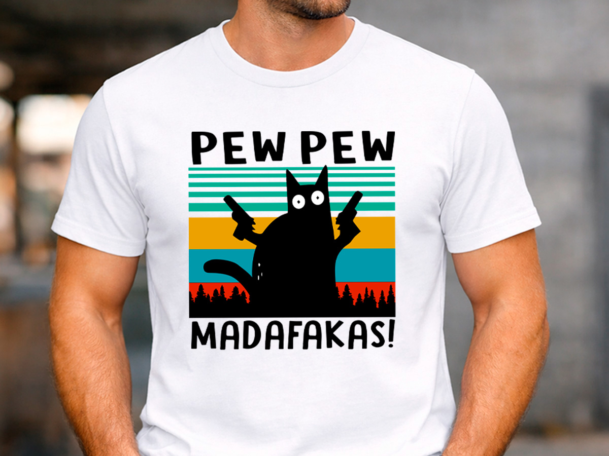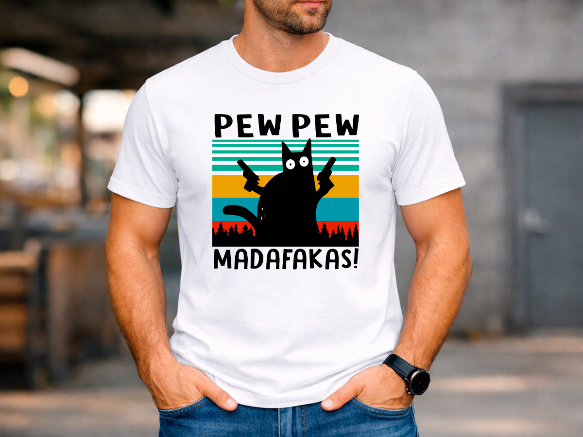 Мъжка бяла тениска „Pew Pew Madafakas“ със забавна щампа на котка и ретро фон. Тениската е перфектна за хора с чувство за хумор и любители на нестандартните дизайни.