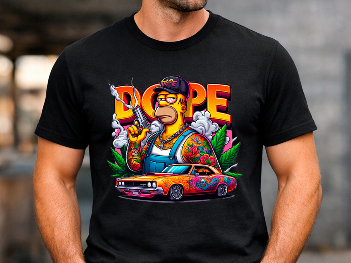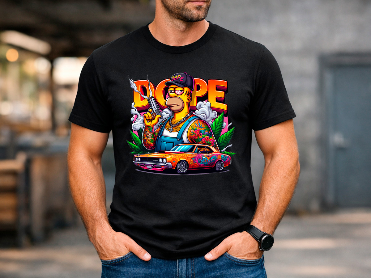 Мъжка черна тениска с DTF печат и Homer Simpson DOPE дизайн – ярък streetwear стил с ретро автомобил.