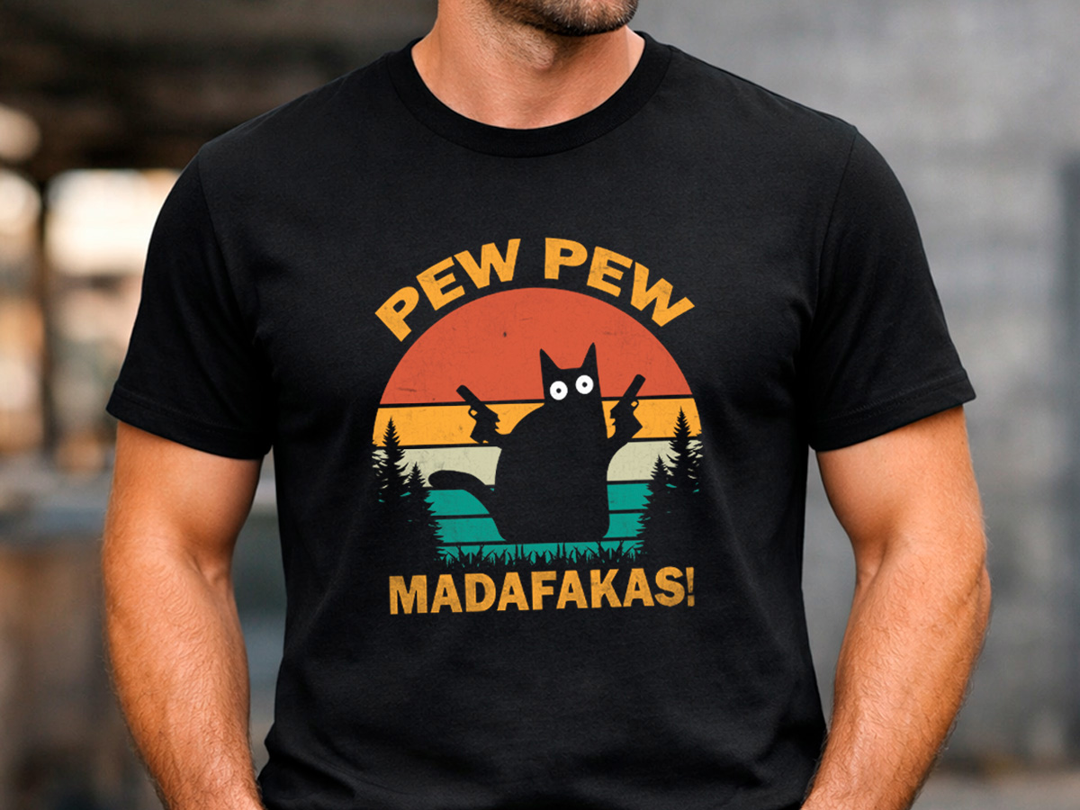Забавна мъжка черна тениска „Pew Pew Madafakas“ с оригинален дизайн на котка в ретро стил. Тениската е идеална за хора с чувство за хумор и любители на нестандартните щампи.