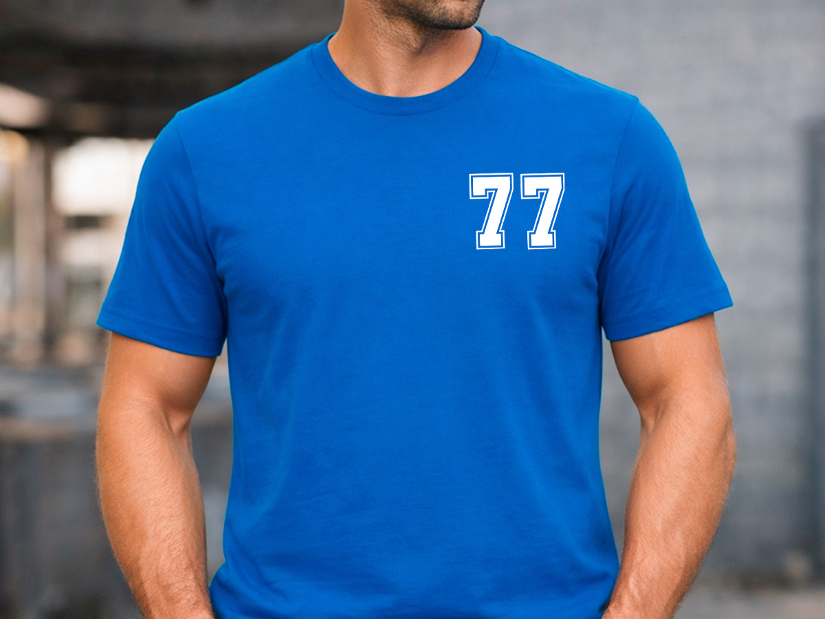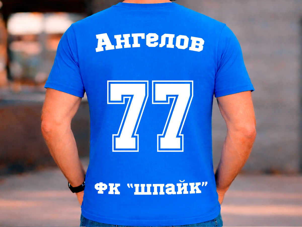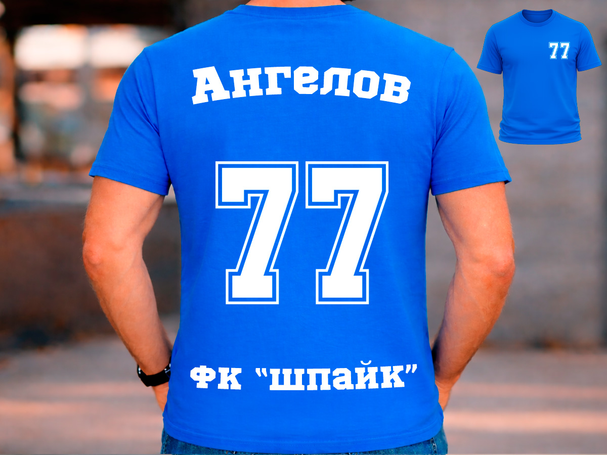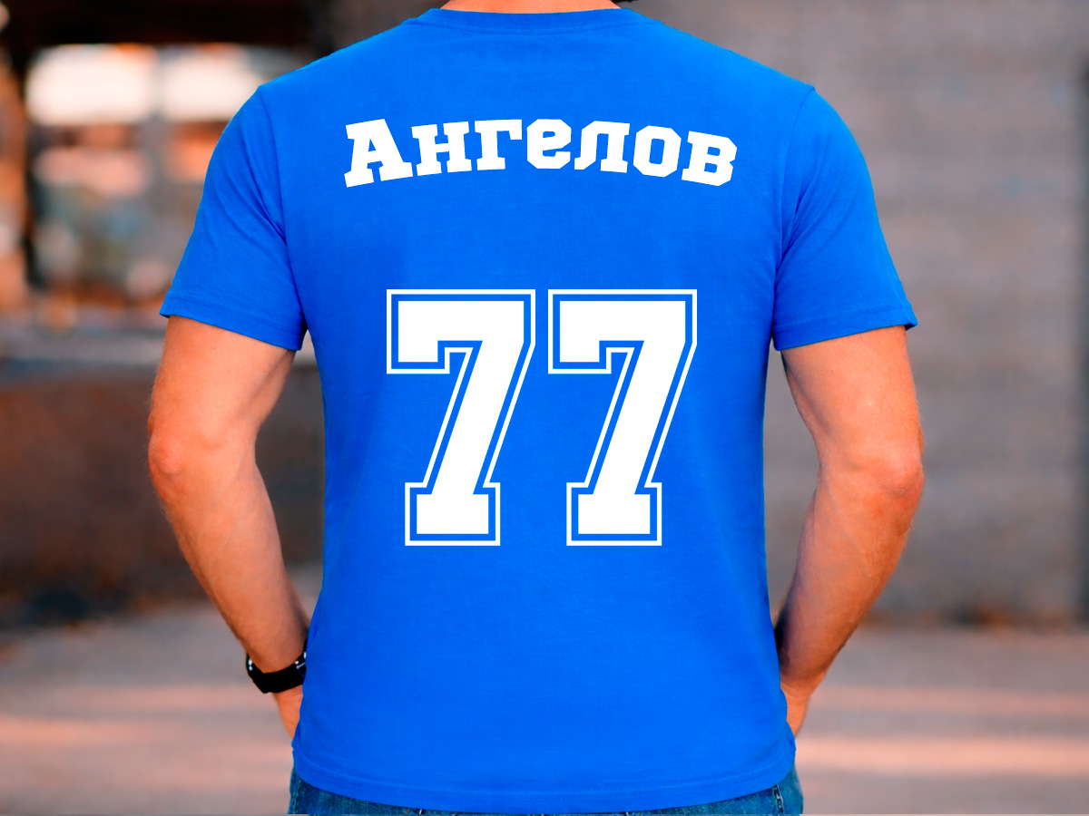Персонализирана мъжка тениска с име, номер и възможност за добавяне на име на отбор – идеален подарък за спортни фенове, отбори или групи.