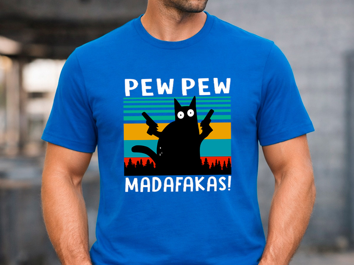 Мъжка синя тениска „Pew Pew Madafakas“ със забавна щампа на котка и ретро фон. Тениската е перфектна за хора с чувство за хумор и любители на нестандартните дизайни.