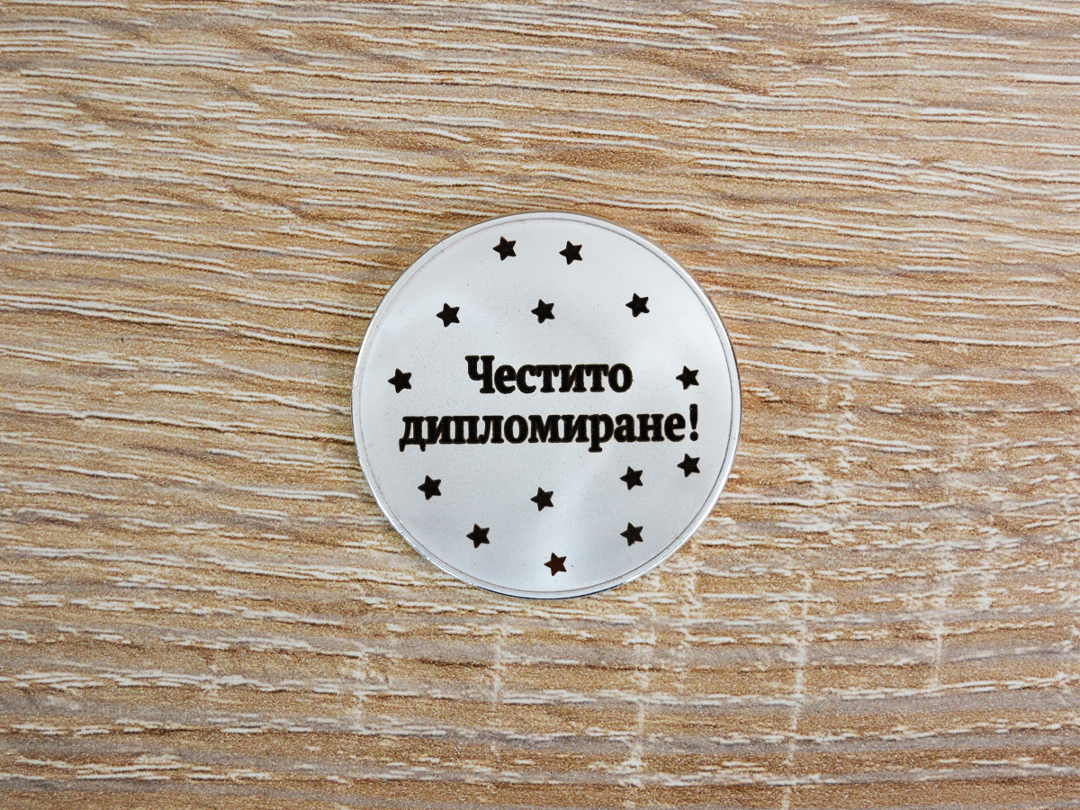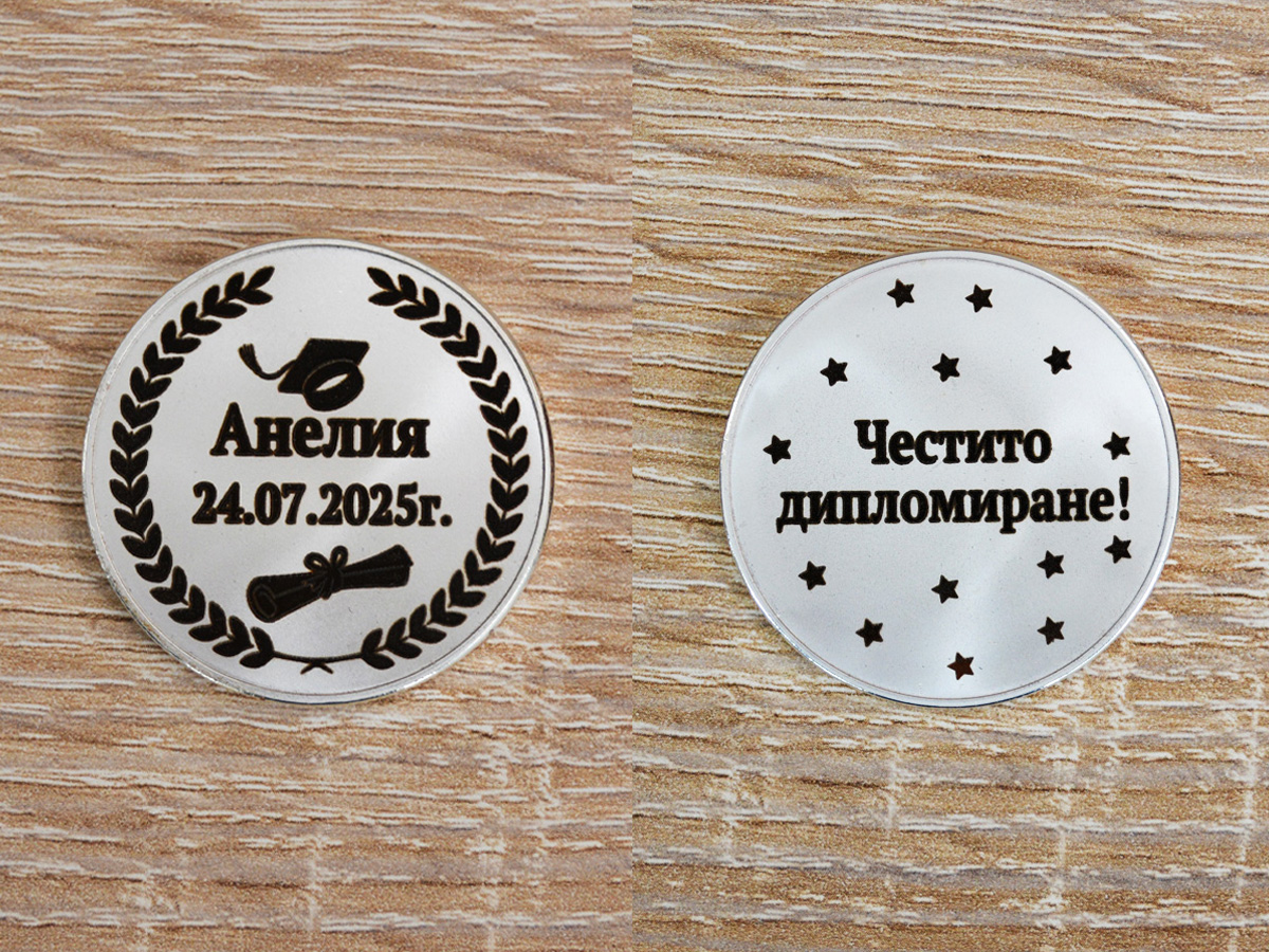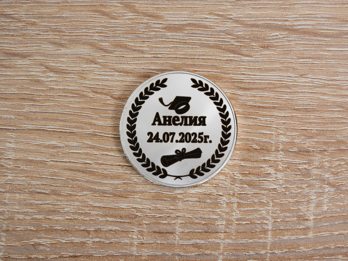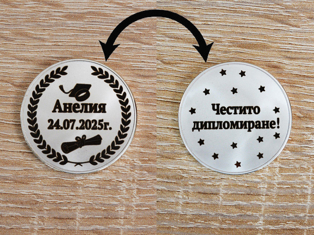 Персонализиран сувенирен медал за дипломиране с гравюра на име и дата. Метален, 38 мм, със зърнист гурт, двустранен дизайн и защитна капсула – стилен и запомнящ се подарък.