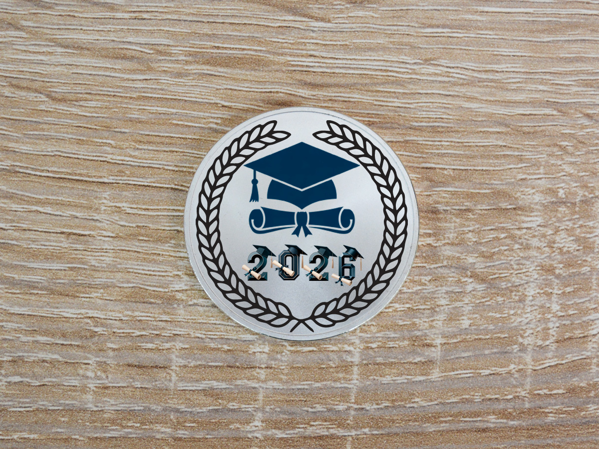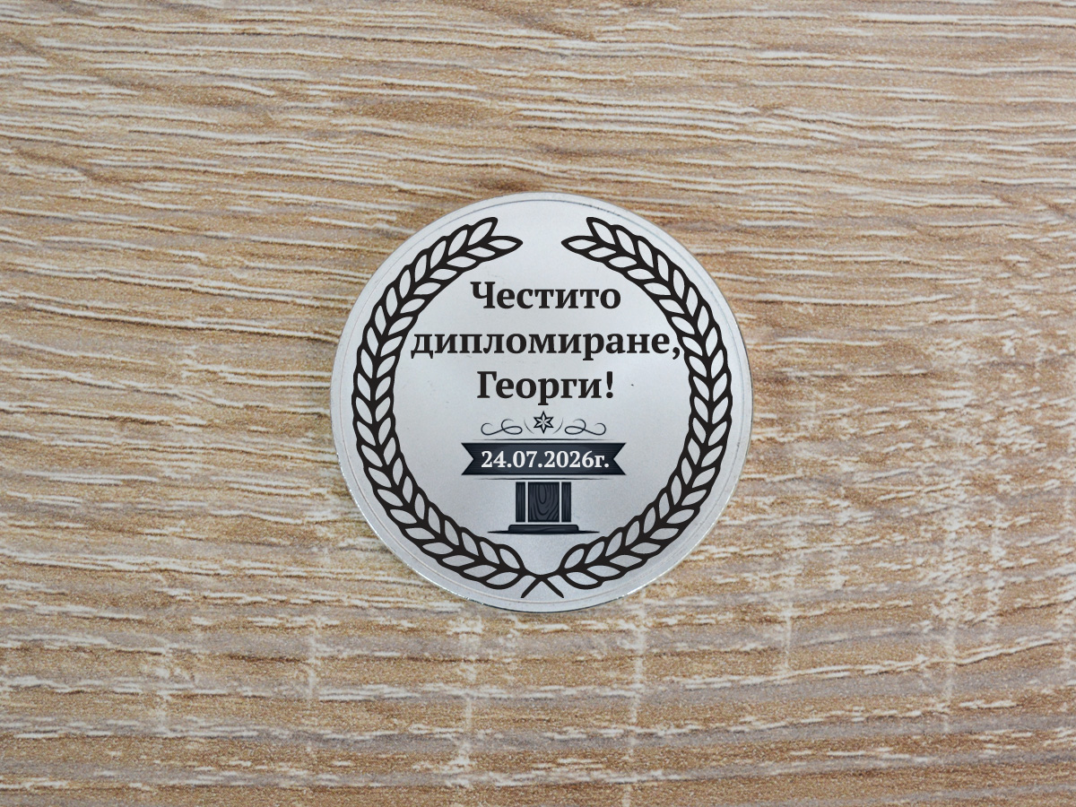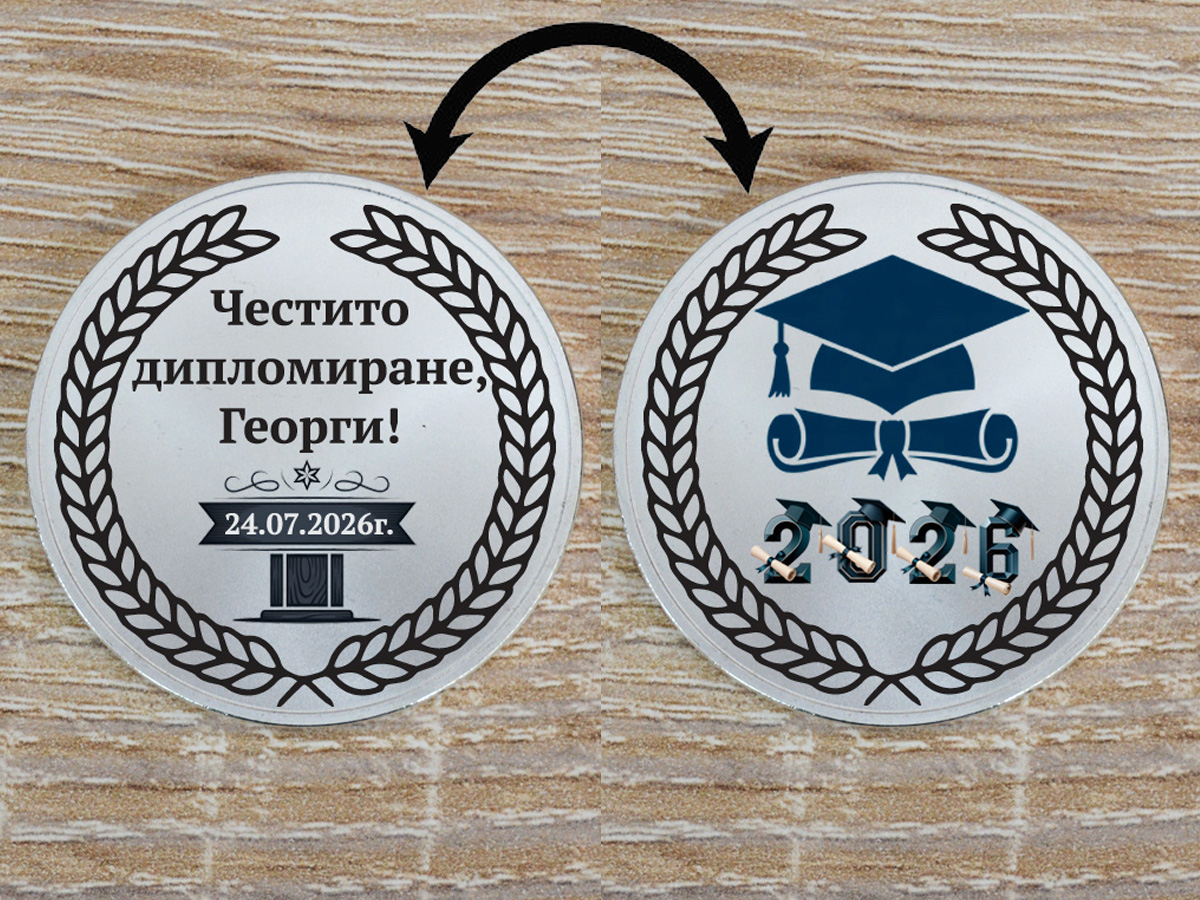 Сувенирна монета – подарък за дипломиране с UV печат. Персонализира се с име, дата и година. Метална, 40 мм, със зърнист гурт и защитна капсула. – стилен и запомнящ се подарък.