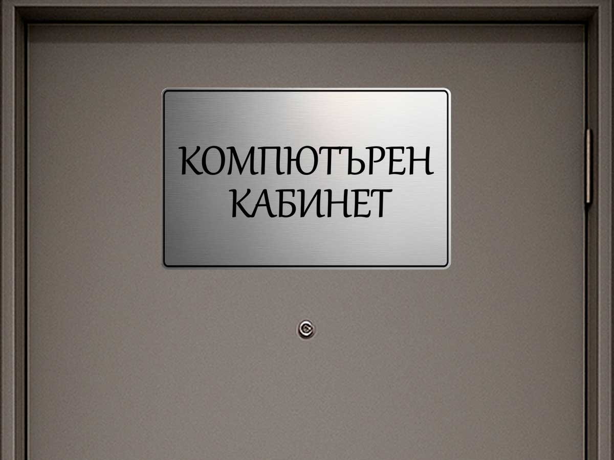 Табела „Компютърен кабинет“ от сребрист ABS с UV печат . Размери 33х17см. Лесно захващане чрез двойнолепяща лента.