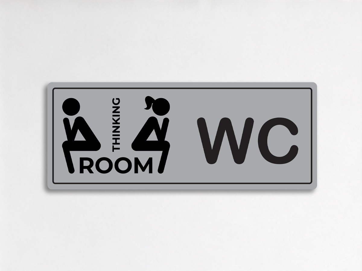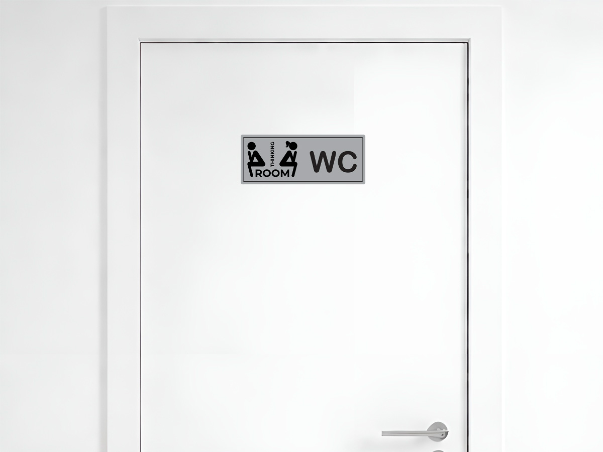 Забавна табела WC „Thinking Room“ от ABS с UV печат. Подходяща за заведения, офиси и барове. Лека, здрава и устойчива. Монтаж с двойнозалепваща лепенка – без пробиване. Два размера – 17х6 и 20х8см.