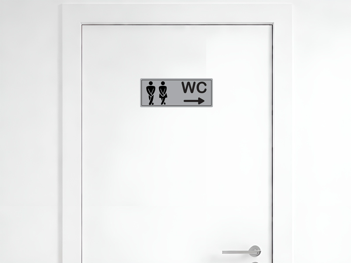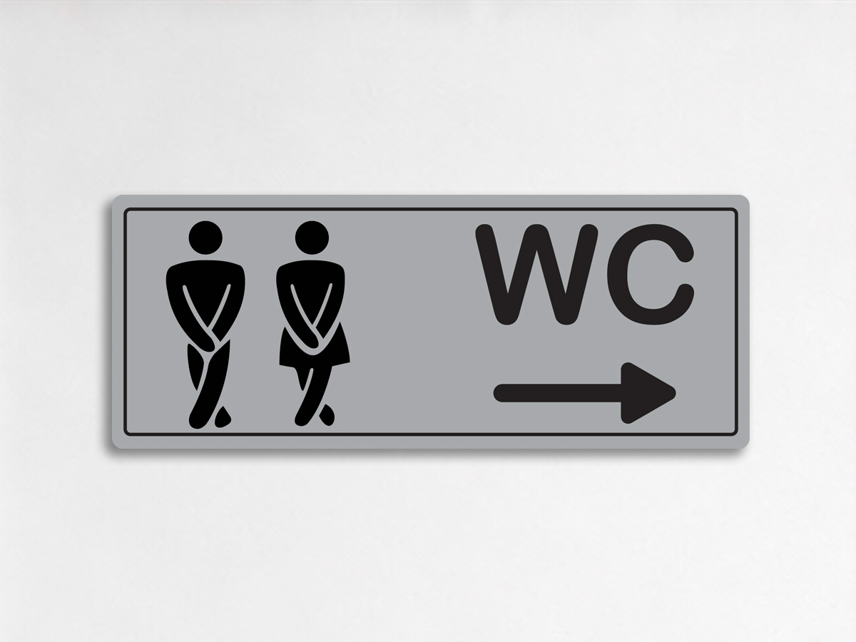 Табела WC от ABS с UV печат, пиктограми за мъже и жени и стрелка за посока надясно. Подходяща за обществени обекти. Лека, здрава и устойчива. Монтаж с двойнозалепваща лепенка – без пробиване. Два размера – 17х6 и 20х8см.
