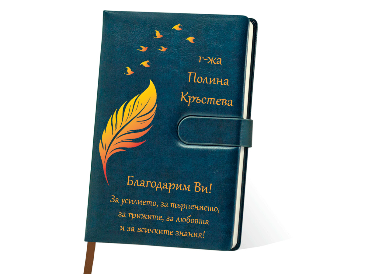 Тефтер А5 с разделител и магнитно закопчаване. Моделът е изработен с внимание към детайла и включва елегантна визия с напечатано перо и птици, които придават изтънчен и класически акцент. Под тази красива графика се изписват избраното от вас име и пожелание, което прави всеки тефтер напълно уникален и личен.
