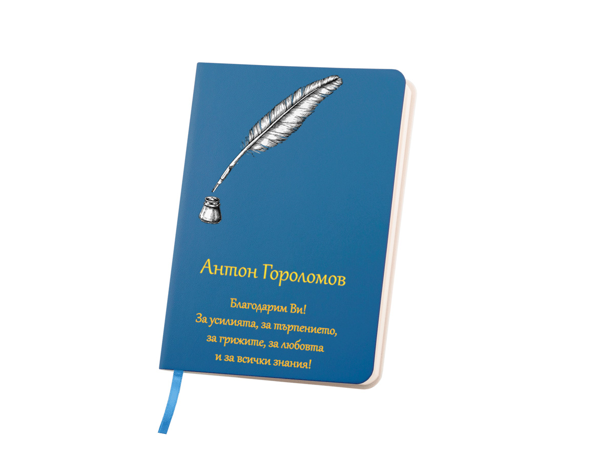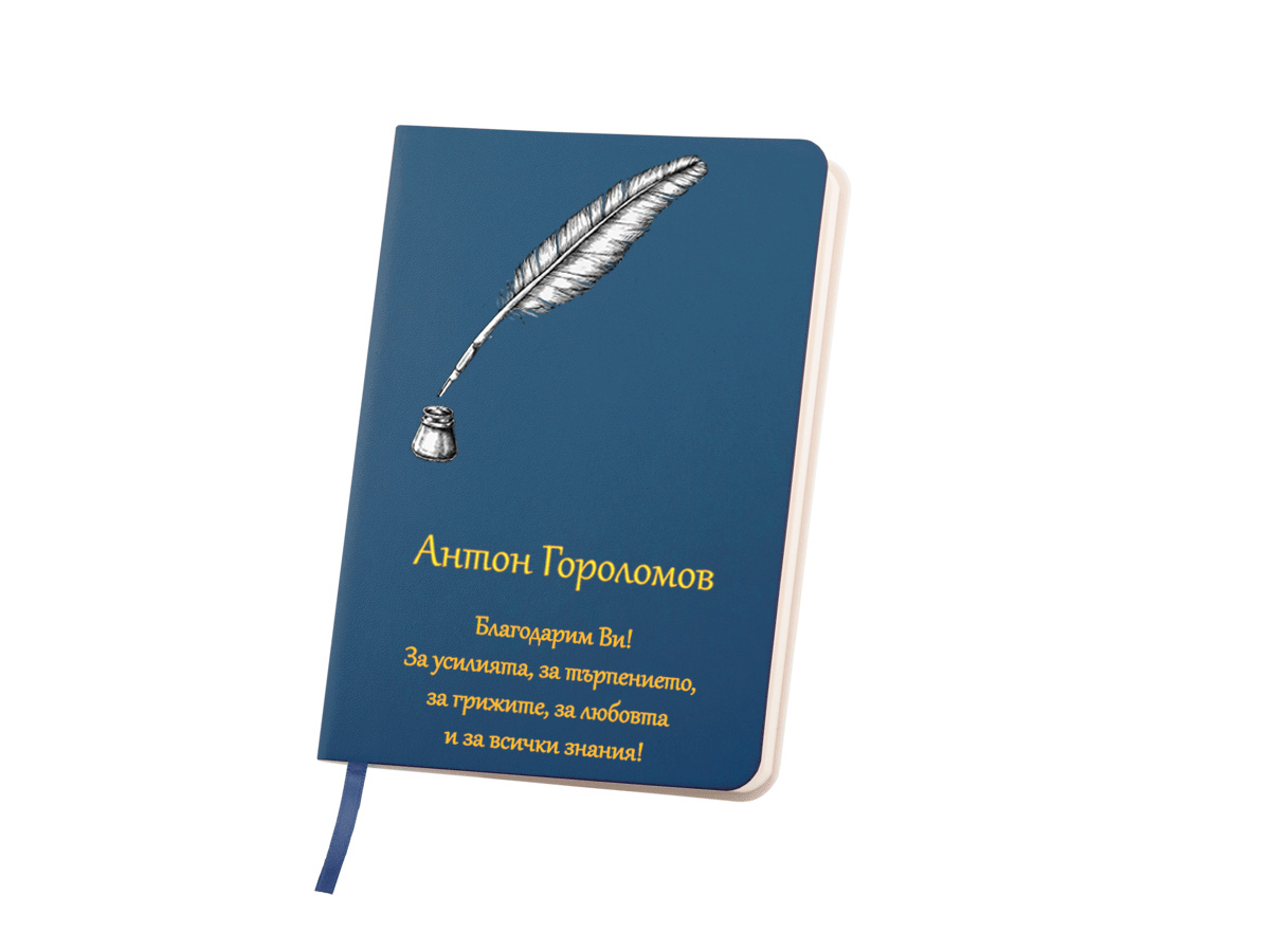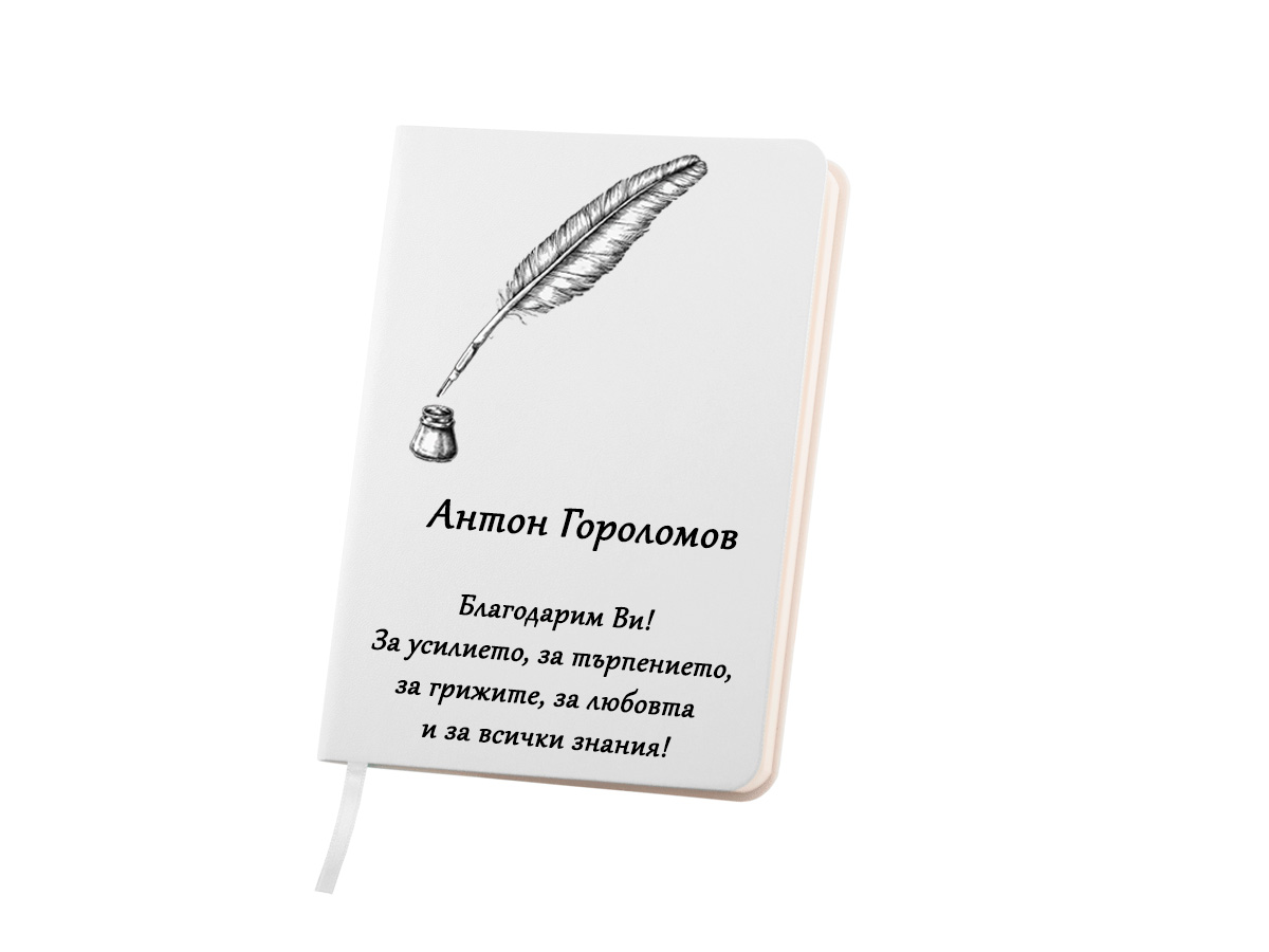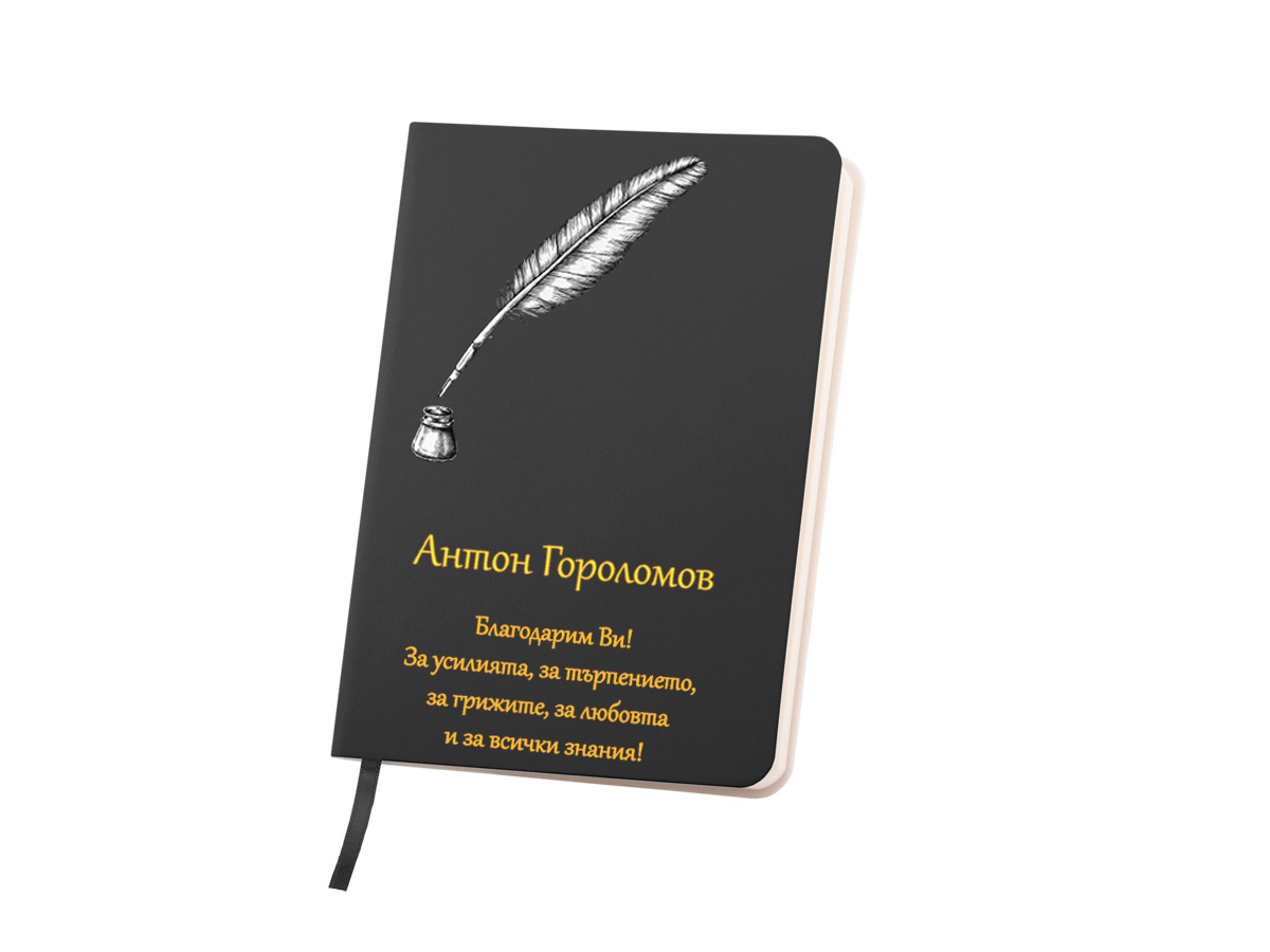 Джобен бележник 110х152x mm. Моделът е изработен с внимание към детайла и включва елегантна визия с напечатана мастилница и перо, които придават изтънчен и класически акцент. Под тази красива графика се изписват избраното от вас име и пожелание, което прави всеки тефтер напълно уникален и личен.