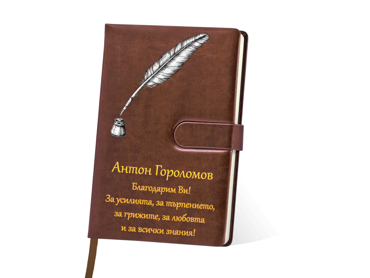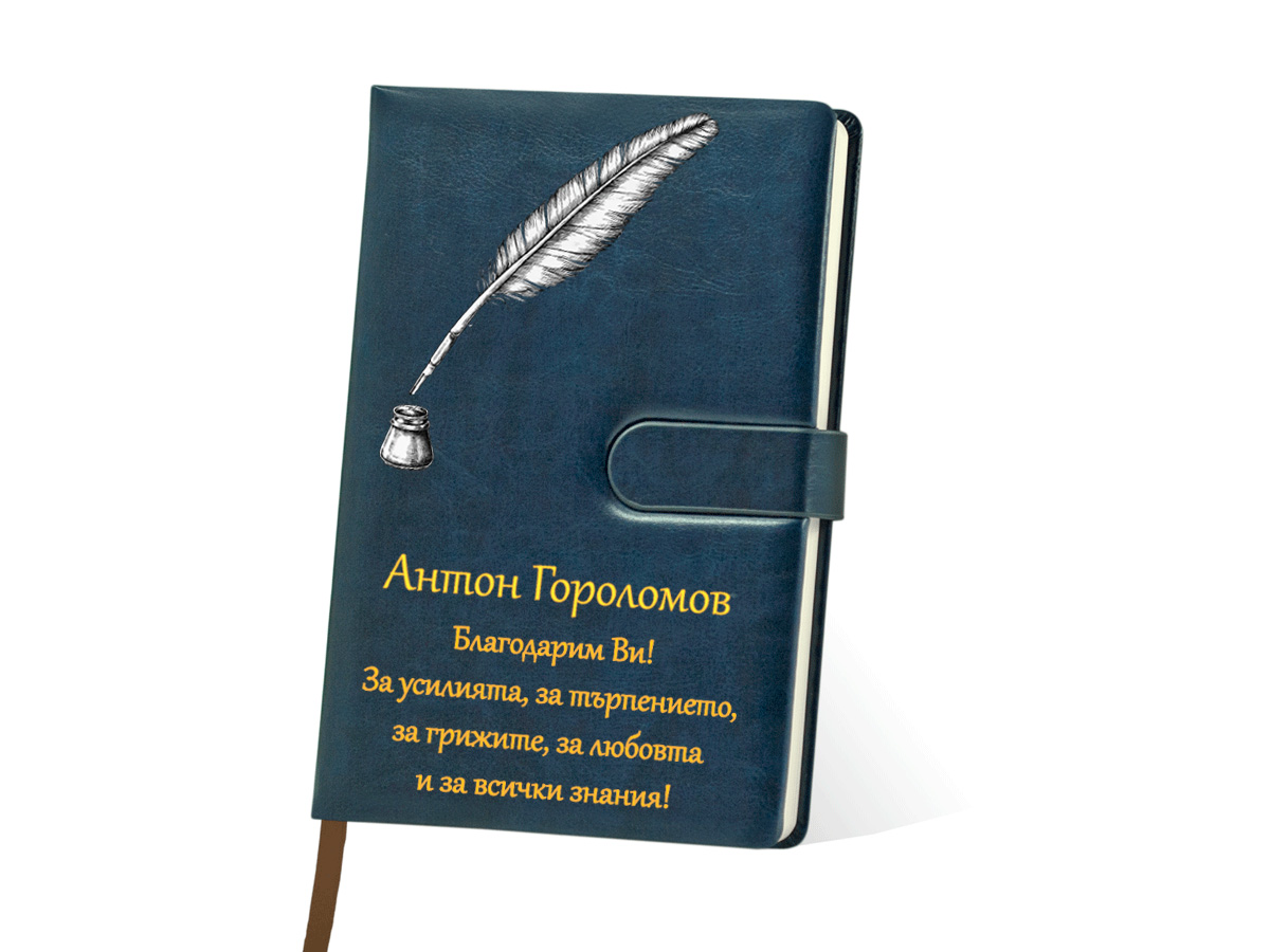 Тефтер А5 с разделител и магнитно закопчаване. Моделът е изработен с внимание към детайла и включва елегантна визия с напечатана мастилница и перо, които придават изтънчен и класически акцент. Под тази красива графика се изписват избраното от вас име и пожелание, което прави всеки тефтер напълно уникален и личен.